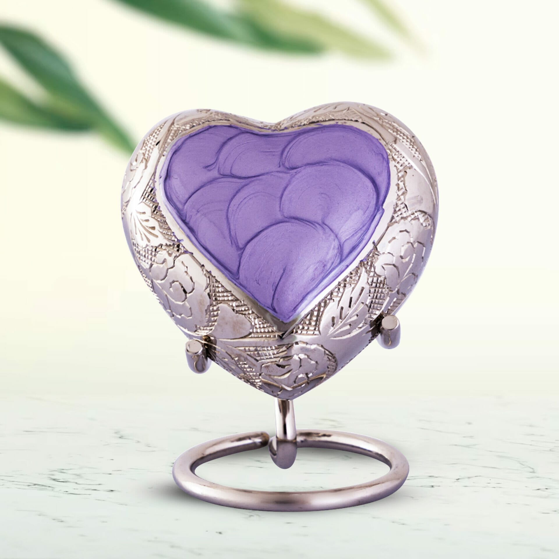 This premium lavender heart-shaped keepsake urn comes with a durable brass stand and a velvet box making it easier to store and display the beautiful piece as you wish.